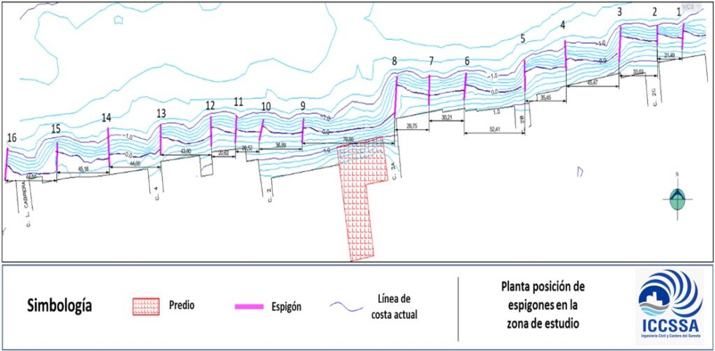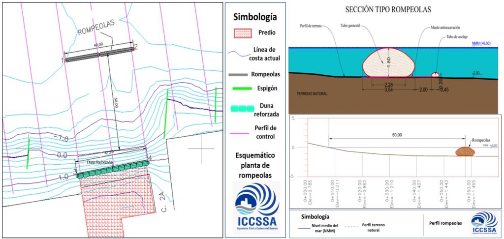 Para disipar la energía de las olas antes de que alcancen la orilla, propusimos la instalación de un cuerpo de rompeolas de 40 metros de longitud, ubicado a 85 metros de la costa. Esta estructura favorece la acumulación de sedimentos (formación de una saliente) sin bloquear por completo el flujo de arena.
