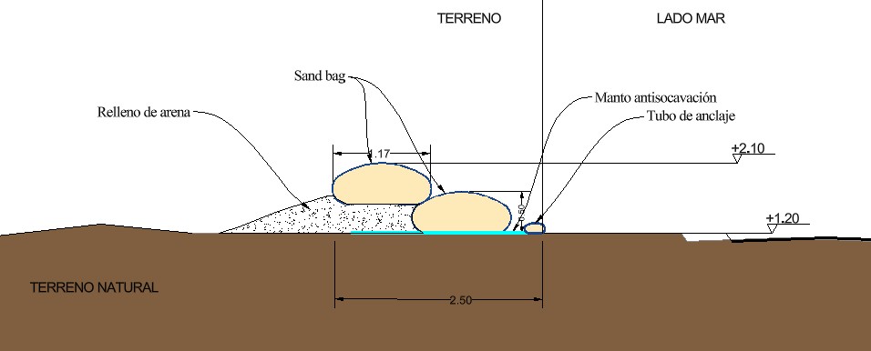 Propusimos una barrera dinámica diseñada para absorber la energía del oleaje. Utilizamos geocontenedores (sand bags) y tubos geotextiles como núcleo, recubiertos posteriormente con arena y vegetación nativa.